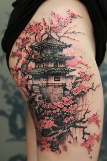 Japanese Castle and Cherry Blossom Thigh Tattoo