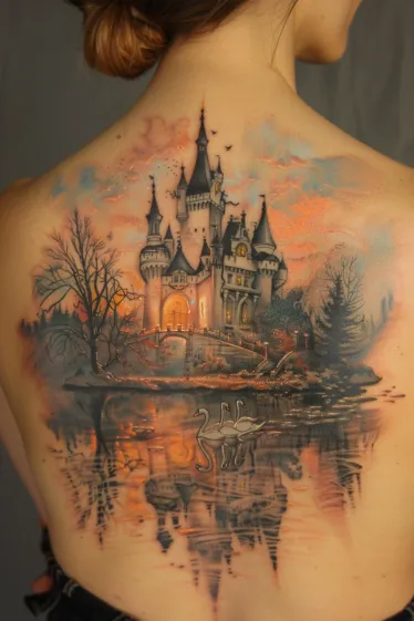 This gorgeous full back tattoo captures a fairytale castle at golden hour, glowing warmly against a dreamy sunset sky. The soft pastel pinks, peaches, and hints of lavender melt into the clouds while the castle stands tall, reflecting beautifully in the still lake below. Two elegant swans float across the water, adding the perfect romantic detail to complete the scene. The whole composition flows with painterly softness, and the subtle trees and bridge create an enchanted forest vibe that wraps across the back like a living storybook.