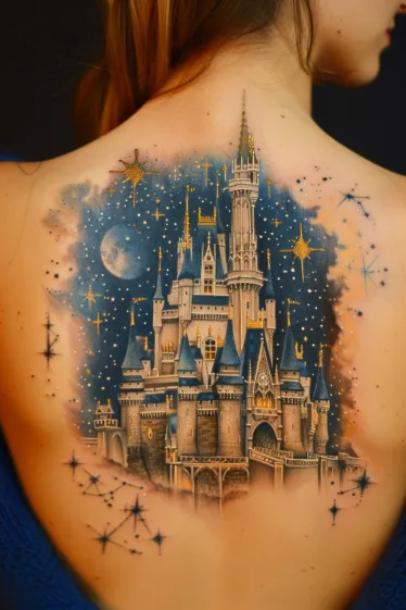 This enchanting back tattoo is pure celestial magic. A dreamy castle rises high in the center, complete with tall towers, glowing windows, and blue rooftops that look like they were plucked straight from a fairytale. Surrounding it is a deep midnight sky dotted with twinkling stars, golden constellations, and a glowing full moon. The entire scene feels suspended in space, like the castle is floating in a galaxy far, far away. The colors are vivid yet soft, blending cosmic blues and shimmering golds with perfect harmony.
