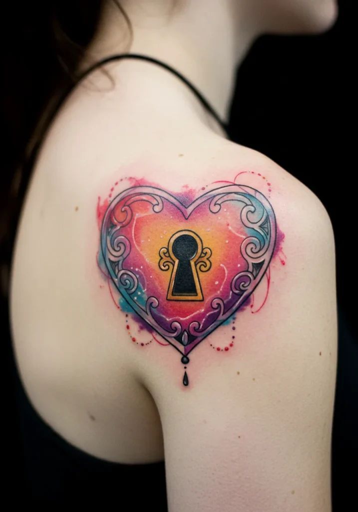 I absolutely love how this tattoo combines symbolism with beauty in such a creative way. The heart represents love, while the keyhole adds a sense of mystery and personal connection. The use of gradient colors makes this tattoo feel light and airy, and the fine lines give it an elegant, delicate touch. It s perfect for anyone who feels a deep connection with the idea of love being something special and worth unlocking, and the colors really bring out a sense of wonder and possibility. It s definitely a tattoo that tells a meaningful story in the most stunning, artistic way!