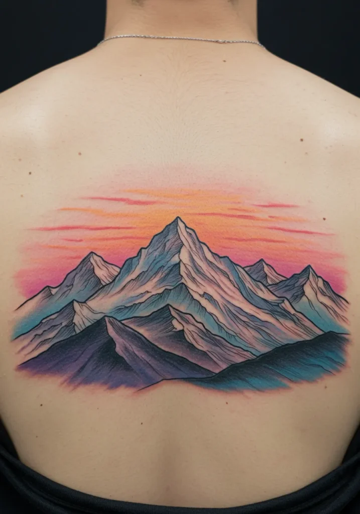 I absolutely love how this tattoo blends the grandeur of nature with an abstract artistic flair. The mountains represent strength and stability, while the vibrant sunset adds a touch of serenity and tranquility. The use of soft gradients and fine lines makes it look both dynamic and calming, making it a perfect choice for someone who finds peace and inspiration in nature s beauty. It s a stunning piece that captures the spirit of adventure and the quiet awe we feel when we look at vast, awe-inspiring landscapes.