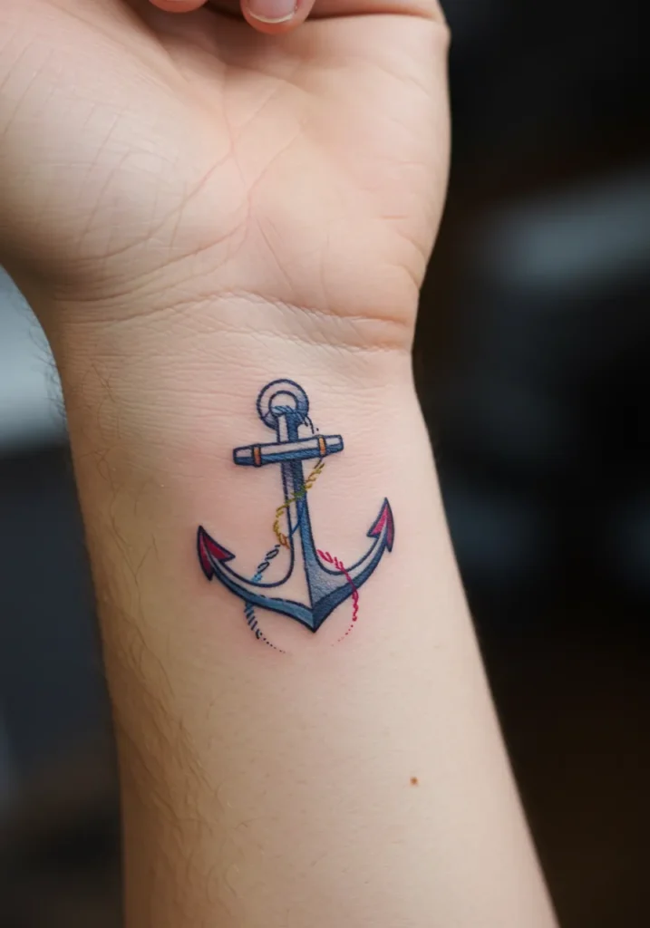 This minimalist tattoo features a simple yet striking anchor design with soft, delicate lines. The anchor itself is outlined in clean, crisp black, and the tattoo is brought to life with the addition of colorful thread-like lines in blue, yellow, and red, which swirl around the anchor. The thread adds a playful and light-hearted touch to an otherwise classic symbol of stability. Placed on the inner forearm, it has just the right amount of visibility while keeping a sense of subtlety.