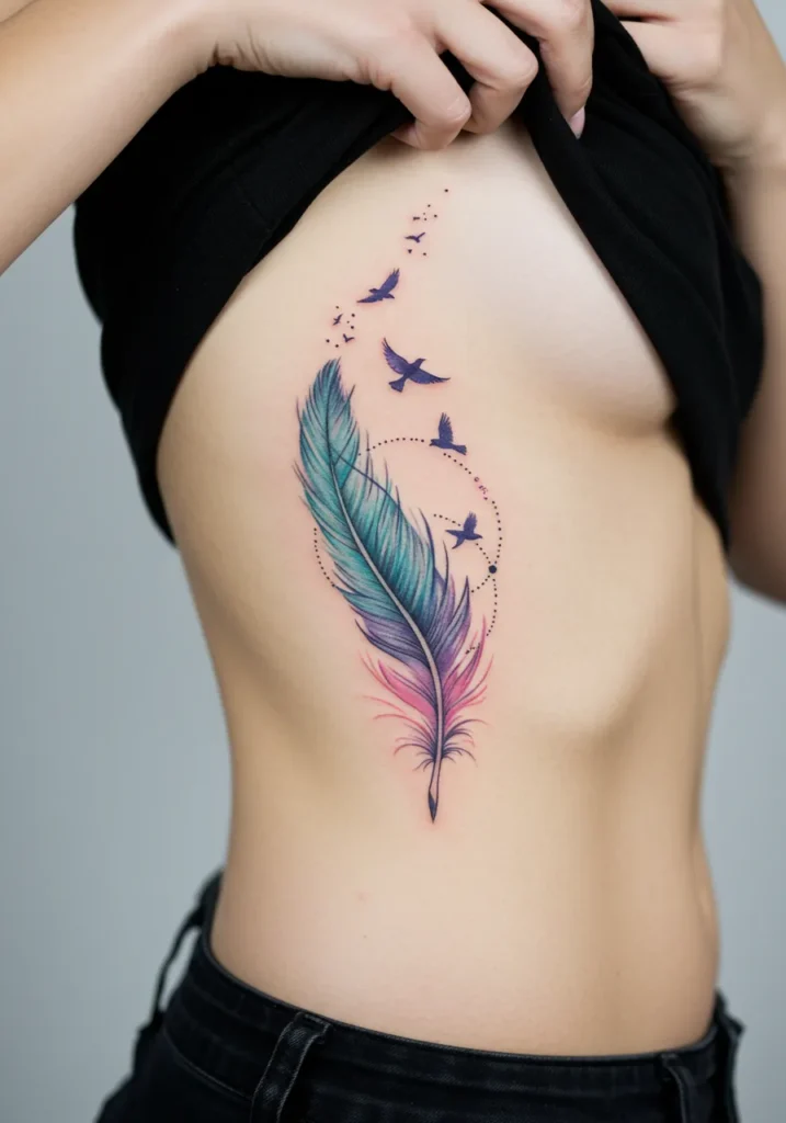This stunning tattoo features a vibrant feather in soft pastel shades of teal and pink, with delicate, intricate details that add a graceful touch. The feather is the focal point, extending down the arm with fine lines that create a light and airy feel. Tiny birds are depicted flying away from the feather, trailing behind them dotted lines that enhance the sense of movement and freedom. The design flows organically down the side, making it both visually striking and subtly feminine.