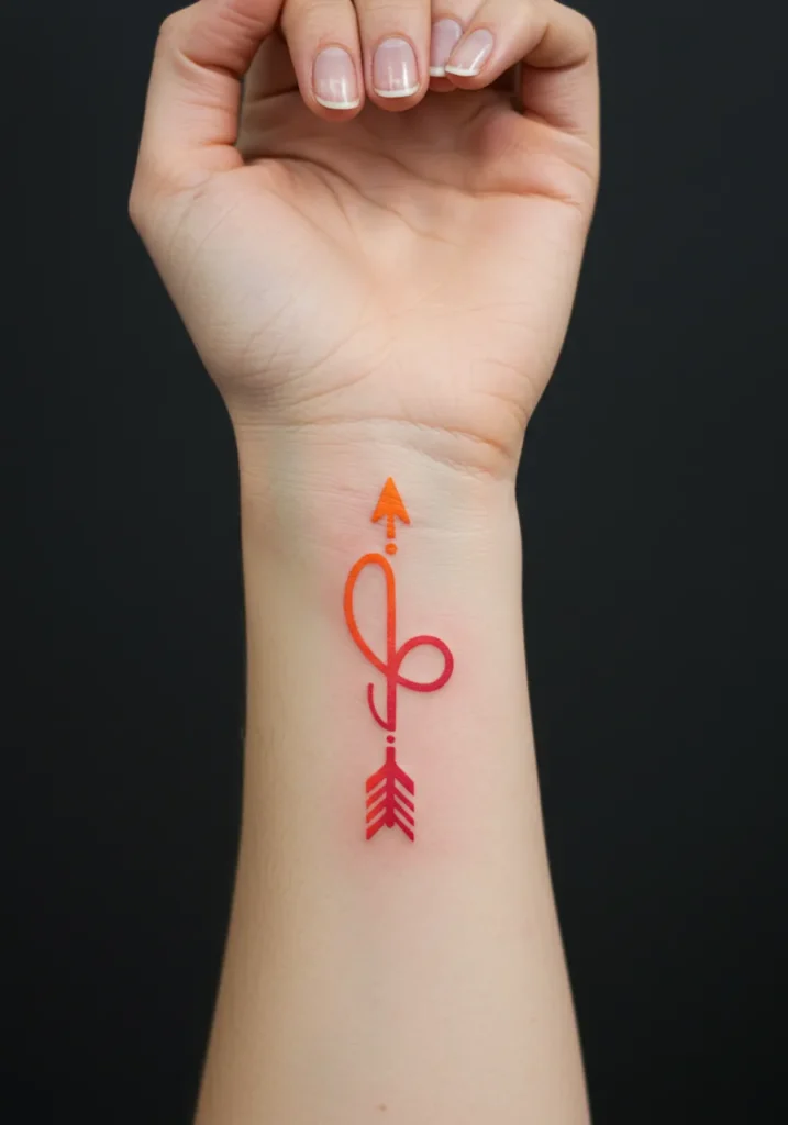 This minimalistic tattoo features a simple yet meaningful design of an arrow with a heart-shaped curve at its center. The arrowhead is sharp and clean, pointed upwards, with soft color gradients transitioning from orange to red. The heart formed by the arrow s tail gives a gentle and fluid contrast, adding a touch of warmth to the otherwise sharp geometric shape. The fine lines are beautifully precise, and the gradient effect creates a modern, vibrant, and sleek design that s placed elegantly along the inner forearm.