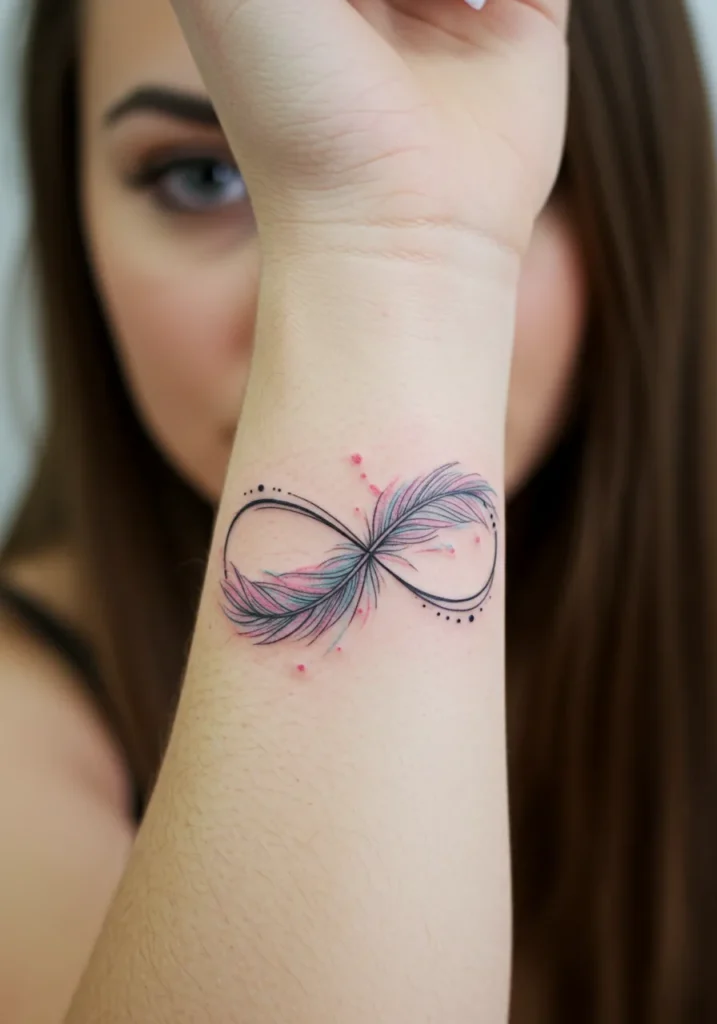 I find this tattoo so charming because it embodies a sense of movement and boundless possibility, which is exactly what the infinity symbol represents. The fine lines of the feather feel light yet intricate, and the color gradients give it such a soft and refreshing vibe. The touch of pink and blue adds a delicate yet impactful pop of color that gives the tattoo a sense of calm and serenity. It s definitely one of those tattoos that not only looks beautiful but also feels deeply meaningful, especially for someone who values the idea of infinite freedom and the journey of life.