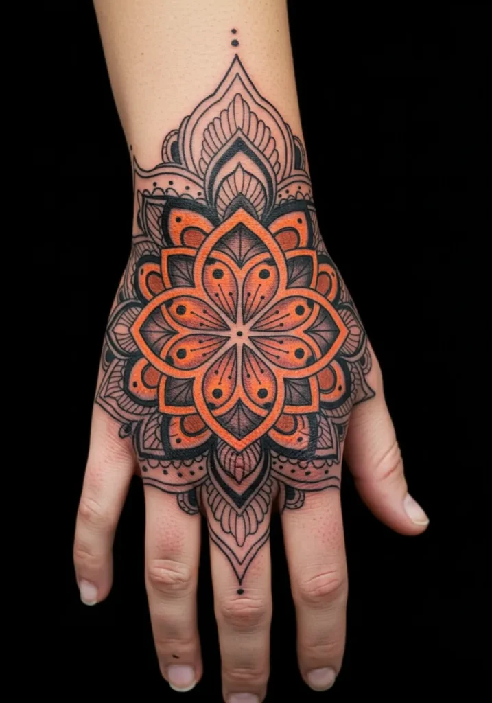 What I absolutely love about this tattoo is how the mandala s geometric beauty blends perfectly with the softness of the flower s natural form. The sharp black lines give it a sense of structure and strength, while the vibrant orange adds a layer of warmth and life to the design. It s bold yet elegant, and the placement on the hand makes it both a personal and eye-catching piece. This tattoo would be perfect for anyone who wants a design that symbolizes balance, unity, and the beauty of the natural world, all in a striking and modern way!