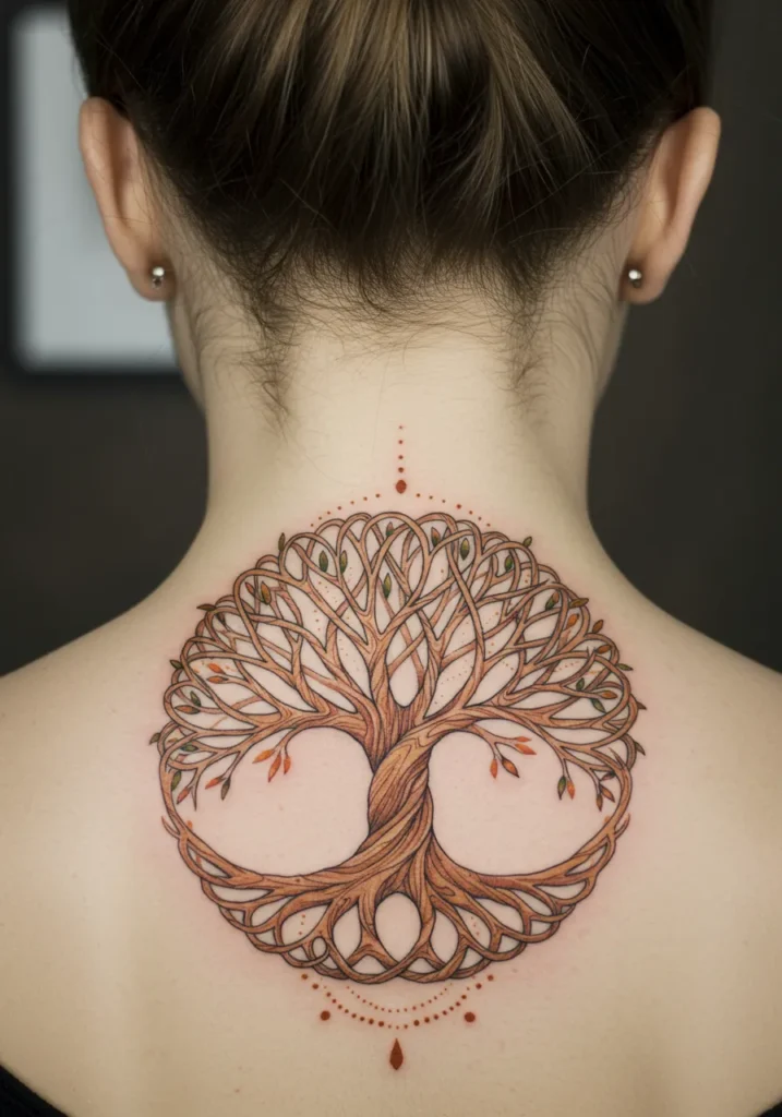What makes this tattoo so mesmerizing is its symbolism the Tree of Life represents growth, strength, and interconnectedness. I absolutely love how this design encapsulates the essence of nature with such delicate and detailed fine lines. The addition of color highlights the beauty of the tree s life cycle, giving it a warm and welcoming vibe. It s a tattoo that feels deeply personal and grounding, perfect for someone who embraces both their roots and the endless potential for growth. Plus, the placement on the back gives it a sense of balance, making it a timeless piece!