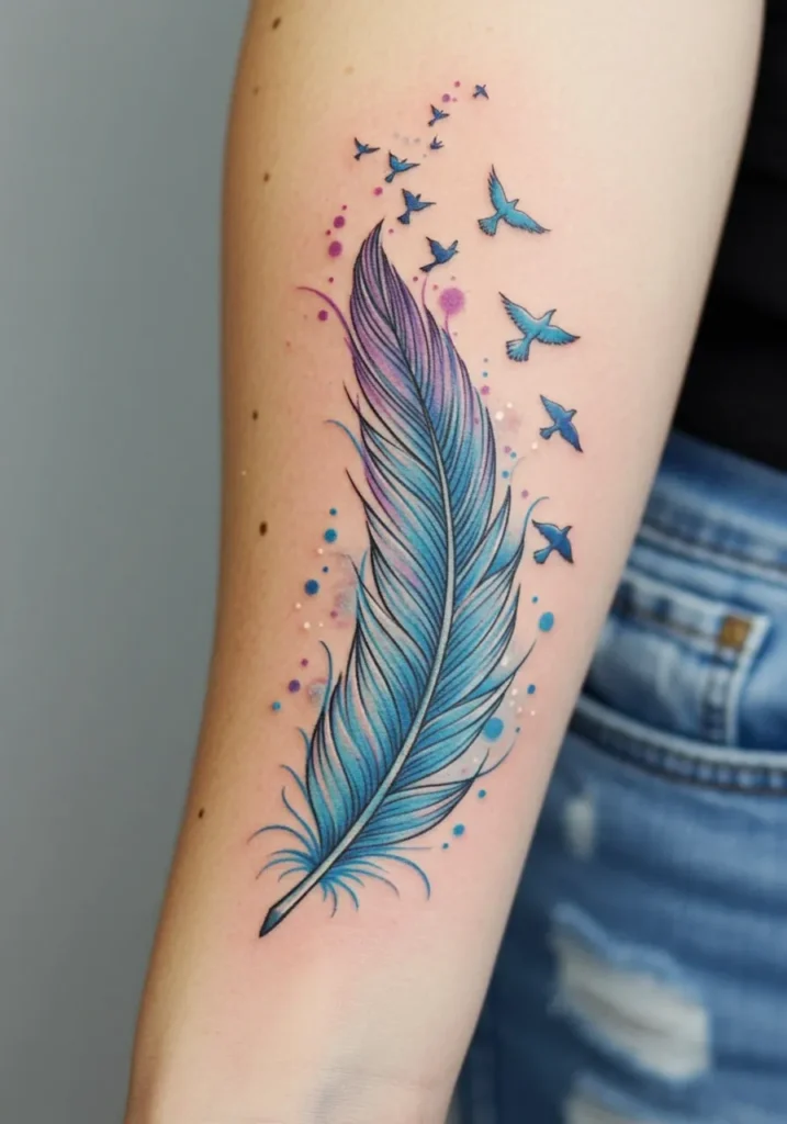 This tattoo showcases a beautifully delicate feather in soft shades of blue and purple, flowing down the arm with fine line details that capture the elegance of the design. The feather is adorned with tiny birds flying upwards, symbolizing freedom and the journey of letting go. Dots and soft splashes of color surround the feather and birds, adding a dreamy, watercolor effect that enhances the ethereal feel of the tattoo. The placement along the forearm creates a natural, graceful flow for the design.