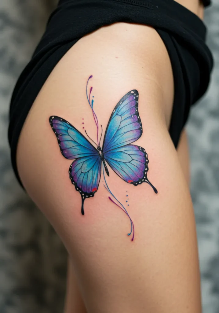 This tattoo features a stunning butterfly in vibrant shades of blue and purple, with soft gradients that give it a dreamy and delicate look. The fine line detailing on the wings adds texture and elegance, while the bold black outlines help the butterfly stand out. The design is further accentuated with colorful trails of dots and lines that flow from the butterfly s wings, giving the tattoo a sense of movement and life. The placement on the upper arm highlights the butterfly s beauty while maintaining a personal touch.