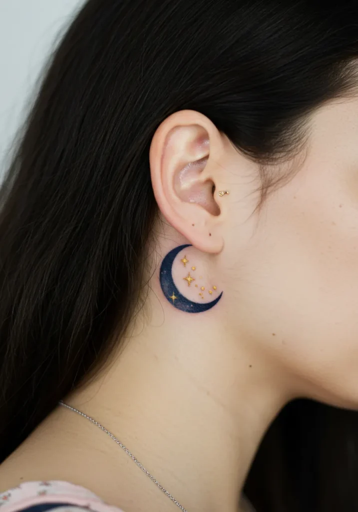 This delicate tattoo features a crescent moon adorned with small twinkling stars scattered around it, creating a dreamy, celestial design. The moon is shaded in dark blues, blending with a starry sky that gives it depth and texture, while the stars themselves are highlighted in gold, adding a subtle but striking contrast. The design is beautifully minimalistic yet powerful, with the fine line work bringing a sense of fluidity and lightness to the piece. Placed just behind the ear, this tattoo has an elegant and discreet feel.