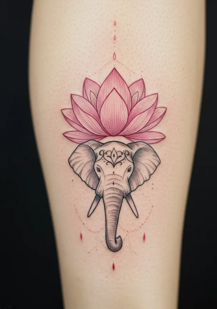 This tattoo features a stunning combination of an intricately designed elephant and a blooming lotus flower, with soft shading and fine line detailing. The elephant s face is beautifully detailed, with symmetrical features and delicate linework that adds a gentle elegance to its form. Above the elephant, the lotus flower blooms in soft pink hues, its petals unfolding gracefully, creating a stunning contrast against the more subtle colors of the elephant. Small, minimal dots in red accentuate the design, adding a touch of color and balance.