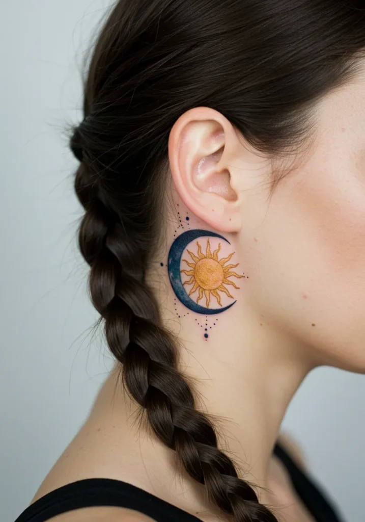 What I absolutely adore about this tattoo is how it plays with the contrast between the sun and the moon. The warm golden sun against the cool blues of the crescent moon creates such a stunning visual, and the delicate detailing makes it feel so refined. Plus, I love how it s placed right behind the ear, which adds a layer of mystery and beauty. It s a tattoo that feels timeless and spiritual, capturing the perfect balance between light and dark in the most artistic way. I m definitely all about this design!