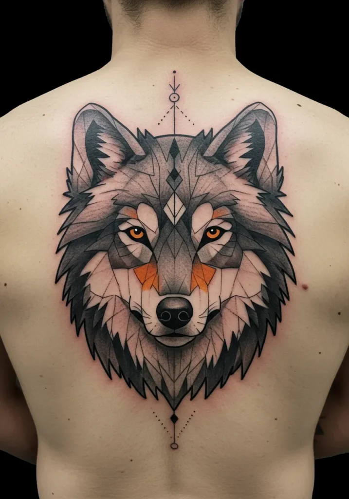 This tattoo features a stunning geometric wolf design, blending intricate angular shapes with smooth, flowing lines. The wolf s face is composed of soft shading, with vibrant orange accents around the eyes and nose, giving it a bold yet refined look. The geometric style adds a modern twist, with sharp lines creating depth and dimension. Above the wolf s head, a series of delicate symbols complete the tattoo, tying the design together beautifully. The placement across the upper back emphasizes the size and striking visual impact.