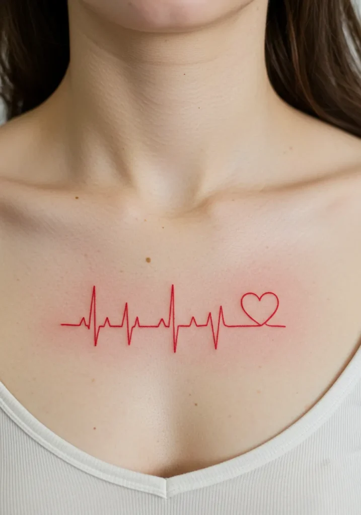 This tattoo features a simple yet striking red heartbeat line that flows across the chest, ending in a delicate heart shape. The fine line design is clean, minimal, and extremely elegant. The sharp, rhythmic peaks and valleys of the heart rate are followed by a smooth curve that turns into the heart, creating a beautiful balance of sharp and soft lines. The tattoo is placed just below the collarbone, adding an intimate and personal touch to the design.