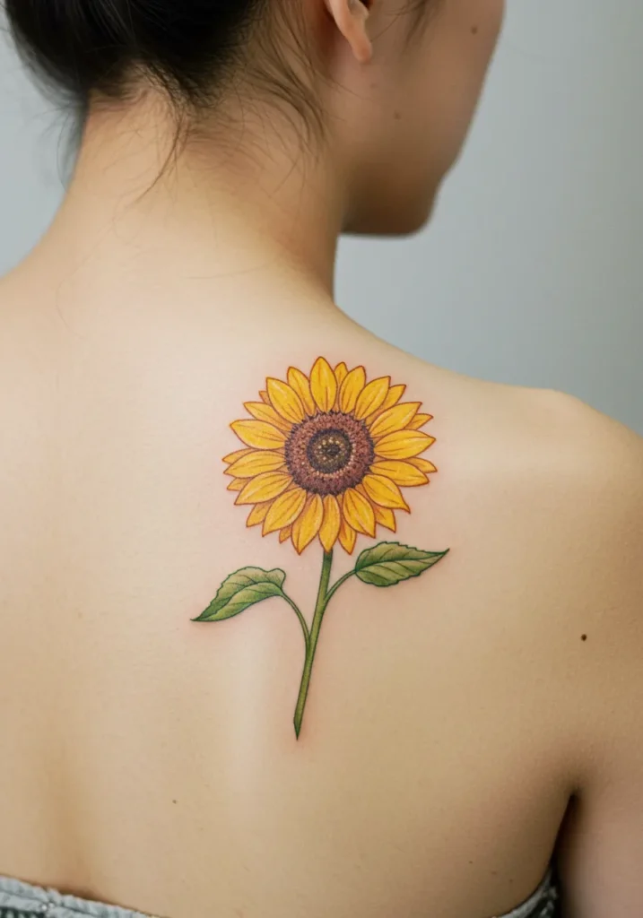 This stunning tattoo features a beautifully detailed sunflower, delicately placed on the upper back. The flower is vibrant with golden-yellow petals that radiate from the dark, textured center, while the leaves and stem add a gentle touch of green. The fine line work is soft, yet sharp enough to highlight the intricate details, giving the tattoo an elegant and natural feel. The placement across the shoulder blade allows the design to flow with the body, enhancing its graceful and organic shape.