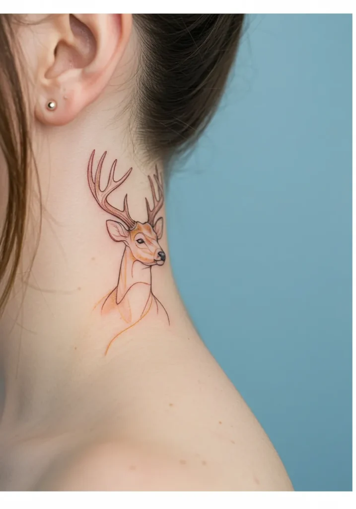 This stunning fine line tattoo features a graceful deer, captured mid-motion with delicate details. The design focuses on the deer s strong, majestic antlers and expressive face, all rendered in soft, minimalistic lines. The tattoo is shaded with gentle touches of earthy tones, giving it an almost ethereal quality. The fine lines emphasize the elegance of the deer, with subtle hints of color that bring life to the piece without overwhelming it.