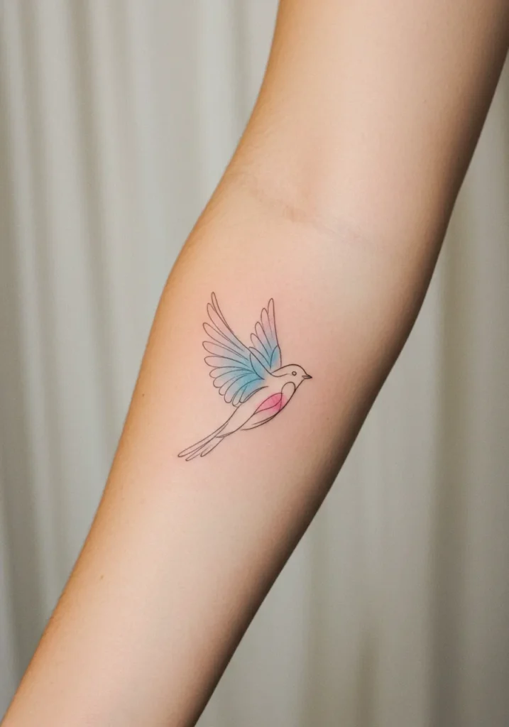 This tattoo showcases a delicate and minimalistic hummingbird mid-flight, featuring soft pastel-colored wings in shades of light blue and pink. The fine line details on the bird s body contrast beautifully with the airy feel of the feathers. The tattoo captures the motion and grace of the bird s flight, with its wings elegantly stretched outward and its body streamlined, giving a sense of freedom and lightness. This design is simple yet expressive, making it a perfect choice for someone seeking a tattoo that feels both vibrant and subtle.