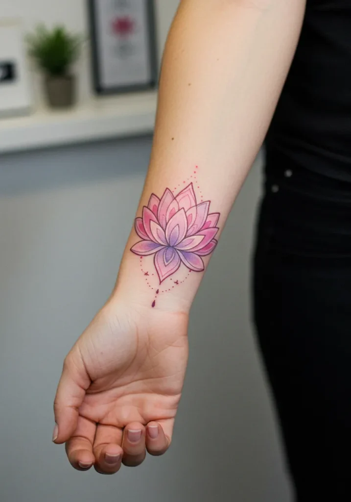This gorgeous fine line tattoo features a beautifully detailed lotus flower in delicate shades of pink, with subtle gradients that make the design feel both soft and vibrant. The flower is elegantly placed on the forearm, with its petals unfolding in perfect symmetry. Around the base of the flower, small, sparkling dots and tiny droplets are scattered, adding an element of whimsy and lightness to the piece. The intricate lines of the flower s design create a graceful, almost ethereal look, making it both a stunning visual and a meaningful symbol.