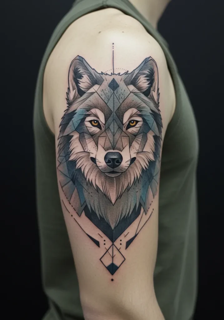 This tattoo showcases a striking geometric interpretation of a wolf s face, masterfully crafted with fine lines and soft shading. The wolf s piercing eyes are highlighted with a touch of warmth, drawing you in with their intense gaze. The use of geometric shapes adds a modern and artistic flair to the wolf s fur, creating a beautiful balance between structure and organic form. The subtle gradient of cool blues and purples gives the design depth, while the clean black lines provide contrast and definition. Positioned on the upper arm, this tattoo makes a bold and captivating statement.
