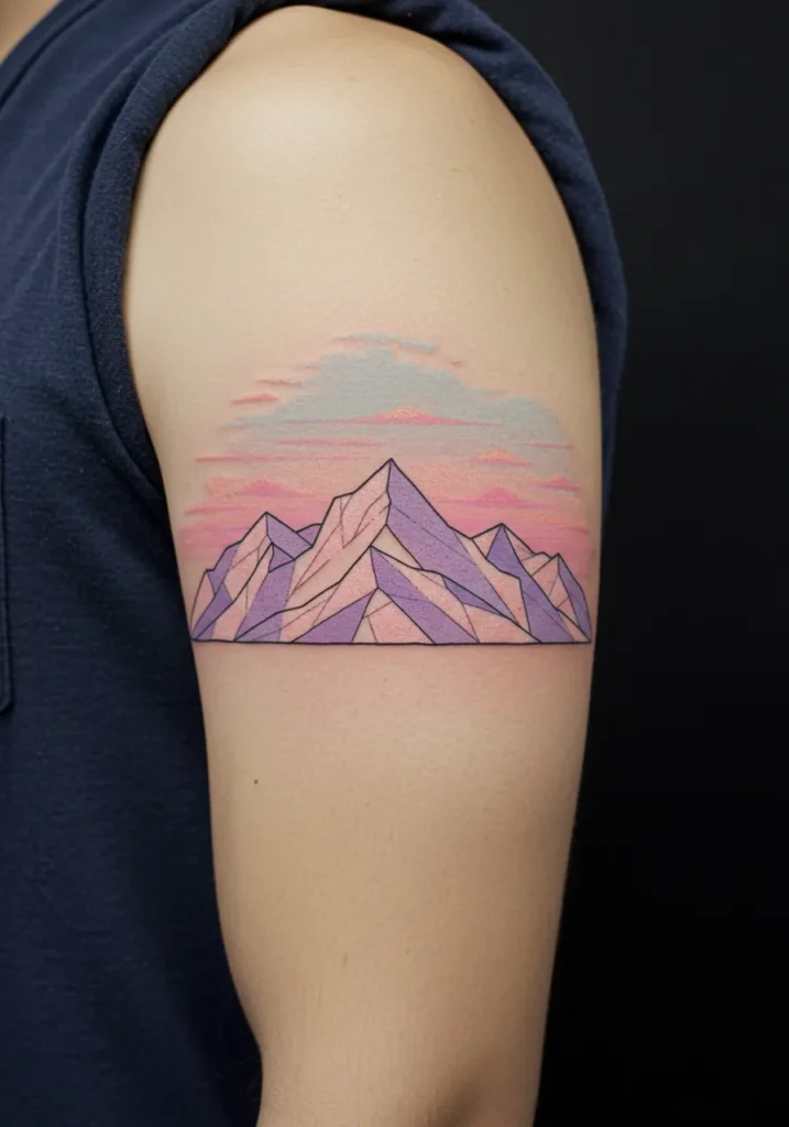 This tattoo features a beautifully minimalistic geometric mountain range, with sharp, angular lines creating a striking visual. The soft gradient pink and purple hues in the background give it a dreamy, sunset-inspired feel, while the clean black lines of the mountains themselves provide a bold contrast. The tattoo is placed on the upper arm, wrapping slightly around to create a natural flow that draws the eye in. The clean geometric shapes are framed with delicate fine line work, adding an elegant and refined touch.