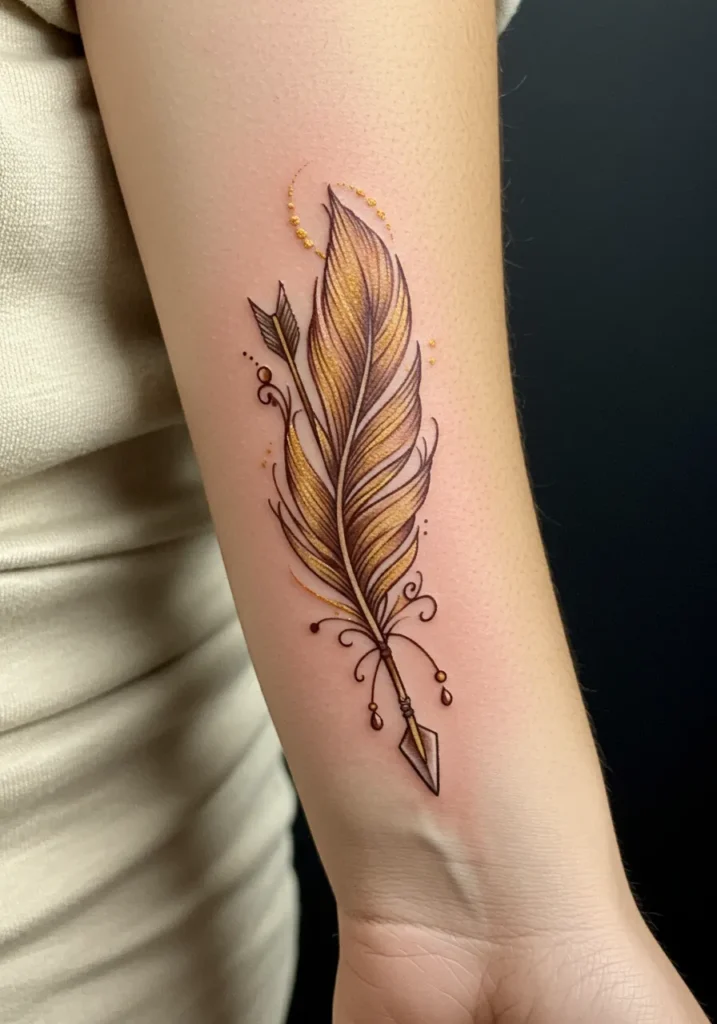 What I absolutely love about this tattoo is how it combines delicacy with strength. The feather symbolizes freedom and lightness, while the arrow at the base adds a touch of determination and direction. The use of gold tones makes this tattoo feel radiant and full of life, while still keeping that minimalist vibe. It s such a chic design perfect for someone who wants a tattoo that s both meaningful and stunningly beautiful. The placement on the forearm also allows it to flow naturally with the body, giving it a gentle yet bold look!