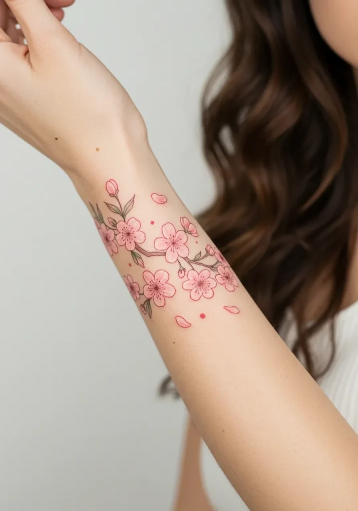 This tattoo features a delicate cherry blossom branch, adorned with soft pink flowers and subtle green leaves. The fine line design emphasizes the gentle, flowing nature of the blossoms, while the addition of tiny pink petals floating around the branch adds a whimsical touch. The tattoo is placed on the forearm, allowing the intricate details to be fully appreciated as it wraps slightly around the arm, creating a graceful and feminine look.