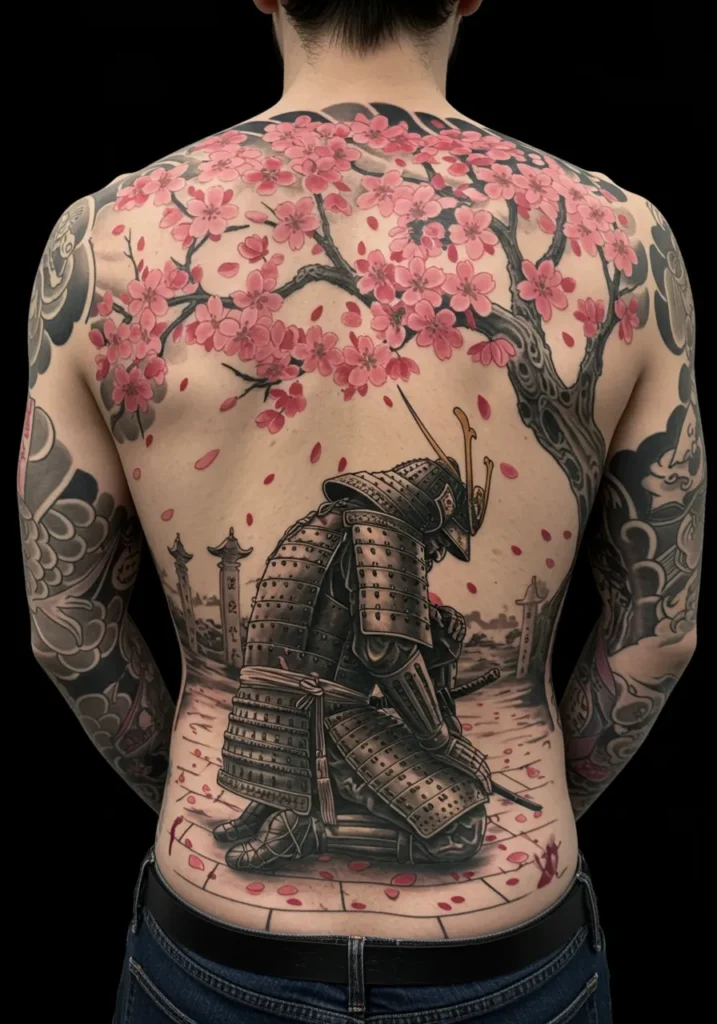 Samurai and Cherry Blossom Memorial Back Tattoo