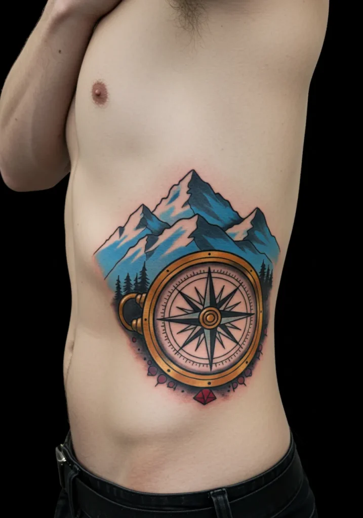 This stunning rib tattoo features a golden compass set against a backdrop of majestic blue-tinted mountains. The compass is shaded so beautifully, with its bold black points and soft metallic glow making it the true centerpiece of the design. Behind it, the layered peaks and tall pine trees create this gorgeous feeling of adventure and wide open skies. The mix of cool mountain blues and warm compass gold makes everything pop perfectly on the skin, giving it a sense of endless possibility and quiet strength.