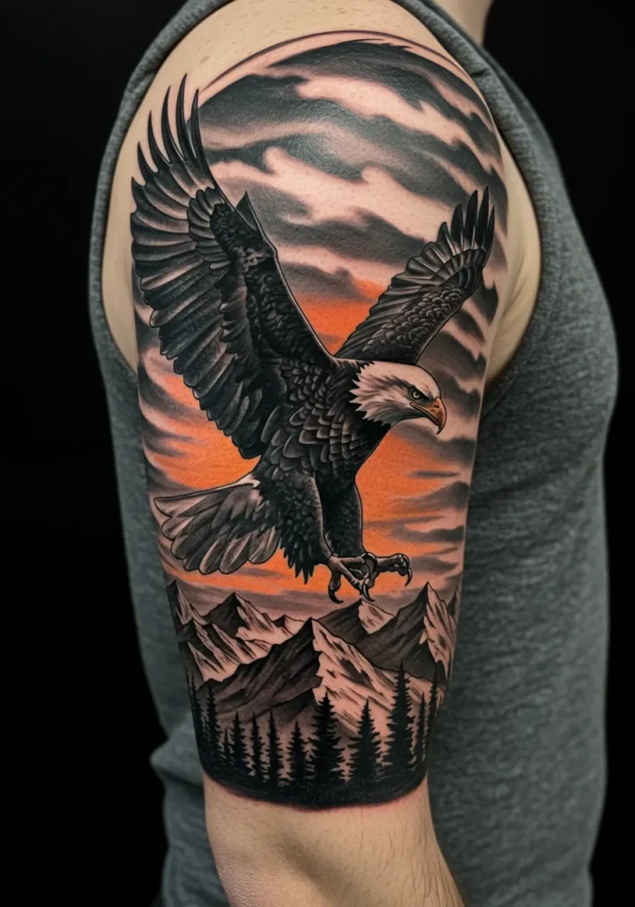 This tattoo captures a breathtaking bald eagle mid-flight across a dramatic mountain range at sunset. The eagle s powerful wings stretch wide, its feathers shaded beautifully in black and gray, with a sharp, determined gaze. Below, the rugged mountains and tall pine trees stand boldly against an orange and smoky sky, giving the whole piece a striking mix of strength and serenity. The rich details in the clouds and the fierce posture of the eagle make it feel like a snapshot of nature s wild spirit frozen in time.