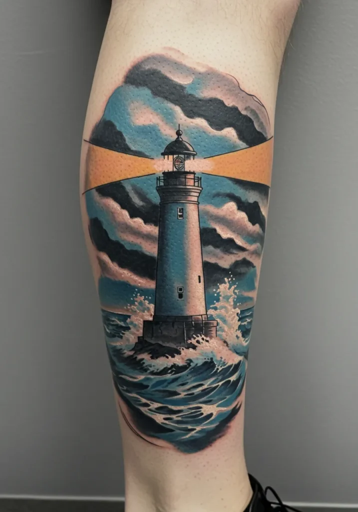 I think this tattoo is so beautiful because it feels like a message of hope without even saying a word. The lighthouse reminds me that even when everything feels overwhelming, there is always a light guiding you home. It is bold, heartfelt, and just so comforting. It would be such a meaningful way to honor someone who was your rock in stormy times.