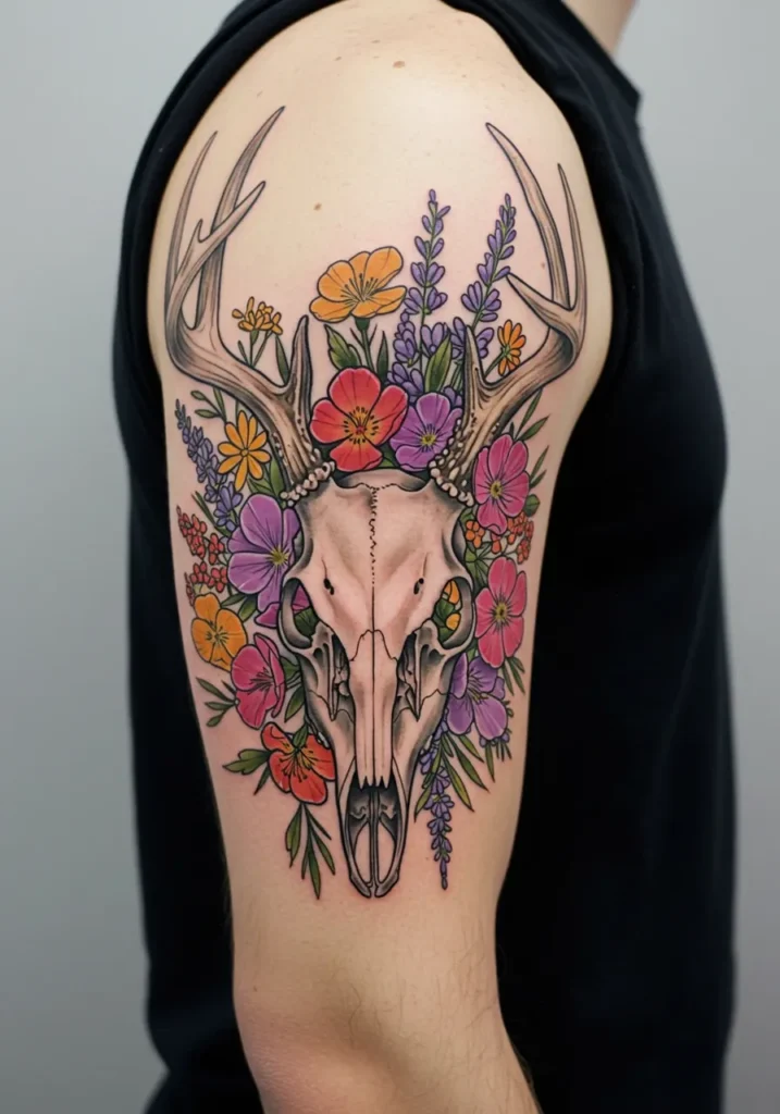This beautiful tattoo frames a deer skull in the center, surrounded by a wild explosion of colorful flowers. Bright orange, lavender, yellow, pink, and deep purple blooms weave through the antlers, creating a soft contrast against the delicate lines of the skull. The way the flowers wrap around the antlers feels so natural, almost like the forest decided to reclaim something sacred. Every detail, from the tiny leaves to the hollow eyes, is drawn with so much care it almost feels alive.