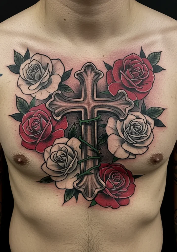 This tattoo features a bold and beautifully shaded cross wrapped in soft green vines, set right at the center of the chest. Surrounding the cross are six perfectly detailed roses, blooming in a mix of rich red and delicate white. The leaves weave naturally around the flowers, giving the whole piece a strong but gentle vibe. The colors are so vivid against the skin, and the careful shading makes the cross feel like it is almost lifting off the chest. Everything comes together in a way that feels full of love, strength, and remembrance.
