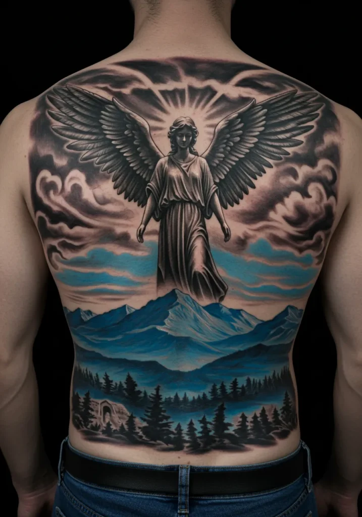This breathtaking full-back tattoo features a powerful guardian angel standing tall over a peaceful mountain landscape. The angel s wings stretch wide across the shoulders, and there is this beautiful glow around the head that makes the figure look almost heavenly. Shades of black and gray swirl through the clouds while the mountains below are painted in calming blues, adding such a peaceful feeling to the whole scene. The trees and little path tucked into the forest give it even more depth, making it feel like a full world captured right on the skin.
