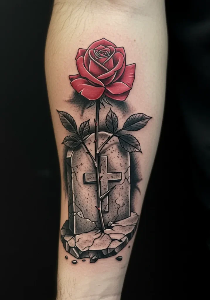 This stunning tattoo shows a single red rose growing out of a cracked tombstone marked with a simple cross. The deep red of the petals stands out beautifully against the muted stone background, making it feel raw and heartfelt. You can almost feel the weight of loss and the stubborn hope blooming through the cracks. The shading around the tombstone gives the design extra depth, while the delicate thorns and leaves bring a touch of quiet strength.