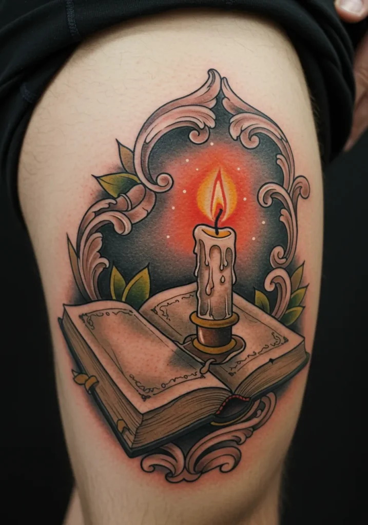 This beautiful thigh tattoo shows a glowing candle resting on the open pages of a worn book, framed by elegant swirls and green leaves. The candle s flame burns bright with soft shades of orange and gold, casting a warm light over the faded writing on the pages. The rich colors and flowing details give the whole piece a timeless, almost storybook feeling, like it holds a hundred memories within its glow. Every little crackle of the candle wax and worn edge of the book is shaded so perfectly that it feels almost real.