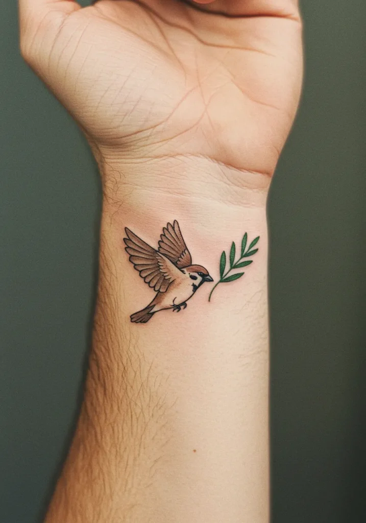 This delicate wrist tattoo shows a sweet little sparrow flying gracefully while carrying a simple green olive branch. The bird s soft brown feathers are shaded perfectly, giving it a light and airy feeling that matches the tiny branch it holds. The size is small but the meaning behind it feels huge, filling the wrist with a quiet and comforting symbol of peace, hope, and remembrance. The clean lines and gentle colors make the whole design feel light as a feather against the skin.
