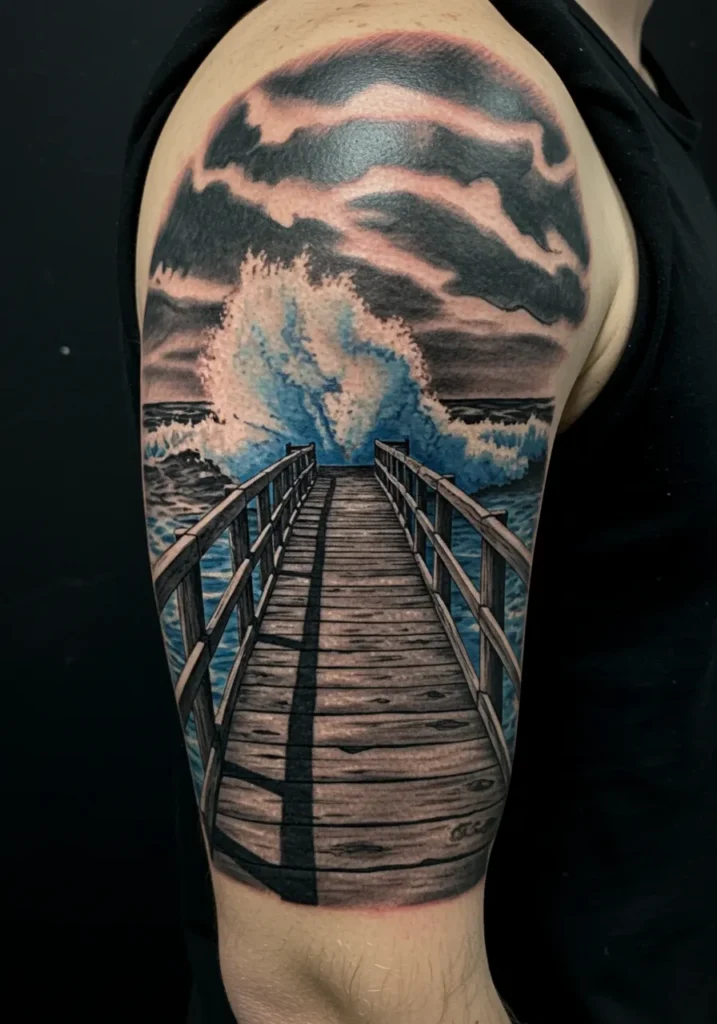 This striking tattoo captures a powerful scene of a wooden pier stretching out into a roaring ocean. The dark, brooding clouds above set such a heavy mood, while the splash of the bright blue waves crashing against the end of the pier feels full of unstoppable energy. Every detail, from the rough wooden planks to the wild spray of the water, pulls you right into the moment. It feels like you are standing there, bracing against the wind, holding on to memories that refuse to be washed away.