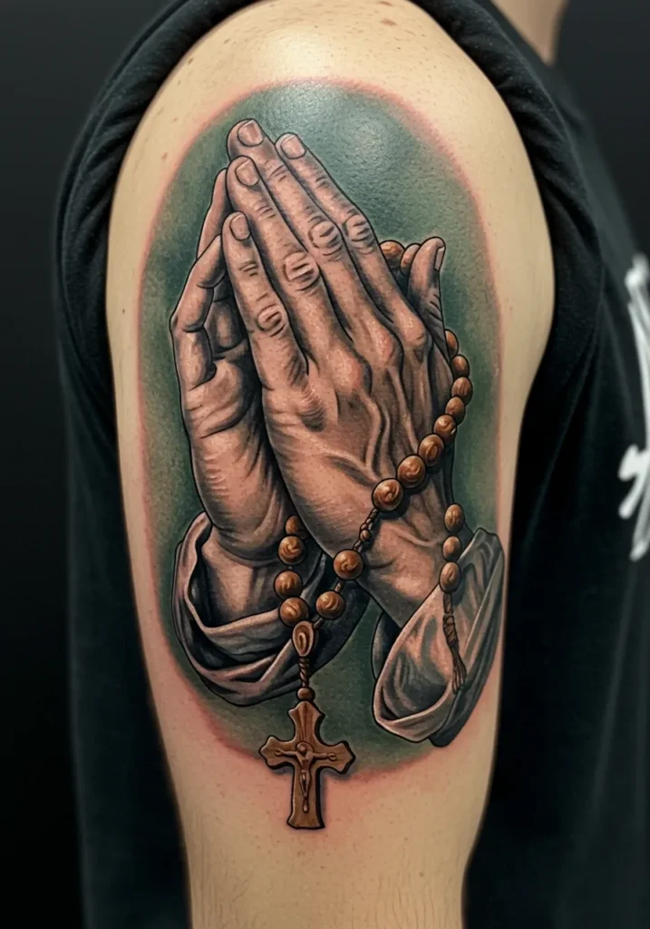 This powerful tattoo shows a pair of detailed praying hands holding a rosary, placed perfectly on the upper arm. Every wrinkle, knuckle, and fold of the fingers is shaded so carefully, making the hands look full of life and emotion. The wooden beads of the rosary wrap softly around the wrists, leading down to a beautifully carved cross that hangs gently. A soft green and pink background circles the hands, giving the whole piece a calm and comforting glow that feels almost sacred.