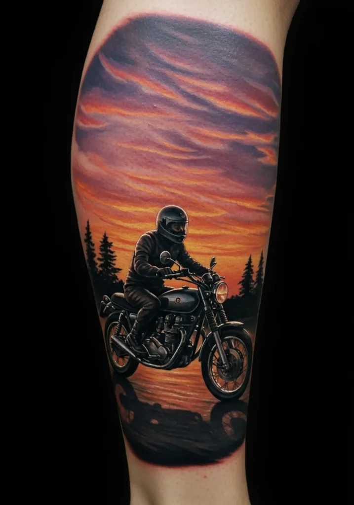 This amazing calf tattoo shows a motorcyclist riding through a breathtaking sunset, with rich orange and purple skies lighting up the background. The trees on the horizon add a peaceful forest feel, while the shining headlight and reflection on the road give the scene such a real and emotional touch. Every detail on the motorcycle is so crisp and clean, from the tires to the handlebars, making it feel like the bike could roar to life at any second. The whole piece flows so naturally across the skin, like a story frozen in one unforgettable moment.