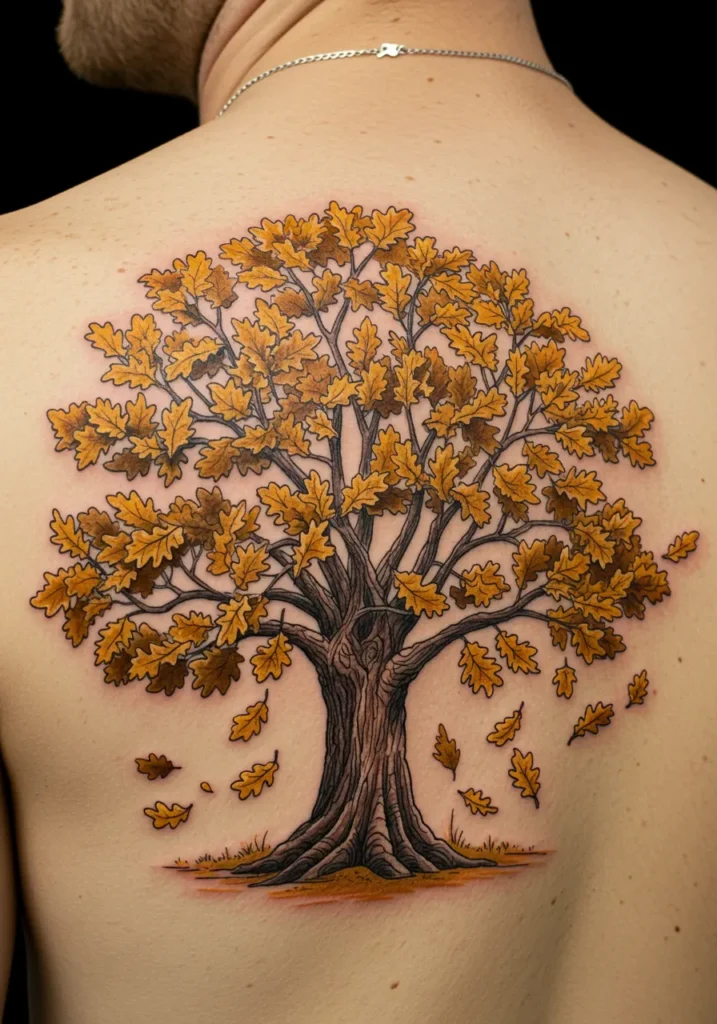 This stunning tattoo shows a mighty oak tree full of golden autumn leaves stretching across the upper back. The branches twist and turn with such a natural flow, giving the tree a sense of deep roots and endless strength. Some of the leaves are gently drifting down, like little moments frozen in time. The rich shades of amber, gold, and soft brown make the whole piece glow warmly against the skin, while the sturdy trunk anchors everything with a sense of quiet power.