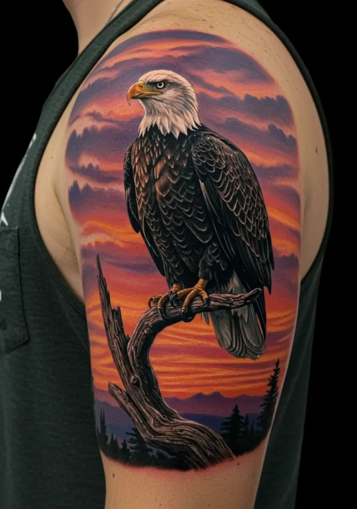This gorgeous tattoo features a majestic bald eagle perched confidently on a weathered branch, set against a breathtaking sunset sky. The vivid purples, oranges, and pinks swirling behind the eagle create such a powerful and emotional backdrop. The eagle s sharp gaze and intricate feather detail make it feel so lifelike, like it could take flight at any moment. Every little line adds strength and spirit to the entire piece, giving it a timeless and moving look.
