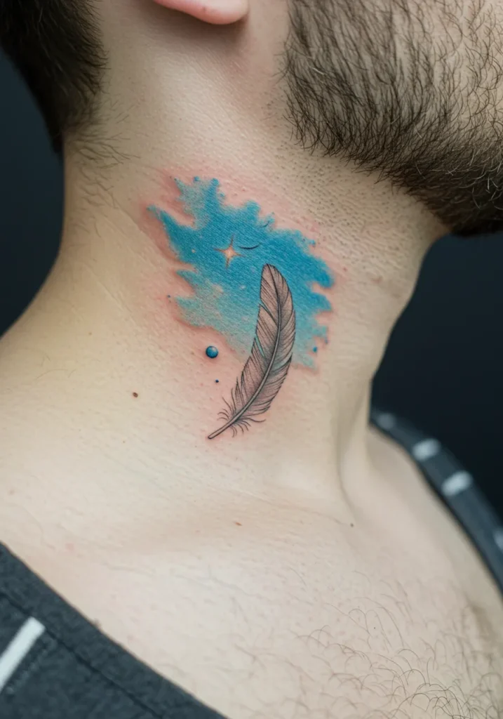 This soft and dreamy neck tattoo shows a delicate feather floating against a splash of watercolor blue sky, with tiny stars and planets twinkling around it. The feather looks so light and real, like it could drift away with the next breath of air. The soft blue background feels full of peace and open space, making the whole design glow gently against the skin. It is small but filled with a quiet beauty that feels incredibly personal and meaningful.