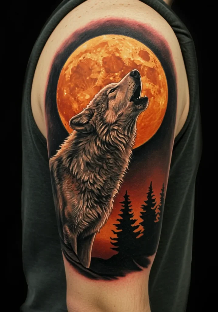 This powerful arm tattoo shows a lone wolf lifting its head toward a glowing full moon, with rich orange and gold shades lighting up the night sky. The wolf s fur is shaded so beautifully, with every little strand bringing it to life. Dark silhouettes of pine trees stretch across the bottom, giving the whole piece a wild, untamed feeling. The way the warm moonlight glows against the dark sky and the wolf s fierce pose makes this design feel full of spirit and strength.