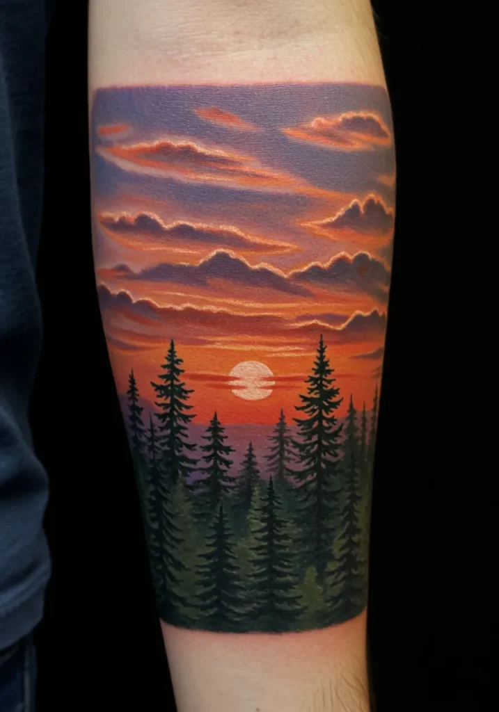 This peaceful forearm tattoo shows a glowing sunset dipping behind a silhouette of tall evergreen trees. The sky is filled with layers of soft purple and rich orange, blending together in a dreamy way that feels straight out of a perfect evening. The clouds are touched with golden edges, giving the whole scene this gentle, magical glow. The dark trees in the foreground bring out the warmth of the sunset even more, creating a beautiful balance between light and shadow.