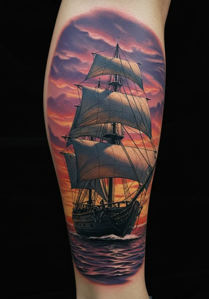 This breathtaking leg tattoo shows a majestic old sailing ship cutting through the waves under a glowing sunset sky. The sails billow in the soft breeze, catching shades of pale gold, purple, and rose from the colorful clouds above. The deep blue water reflects the sunset perfectly, adding a dreamy shimmer to the scene. Every rope, mast, and shadow is so carefully detailed, making the ship feel full of life and ready to sail right into the horizon.