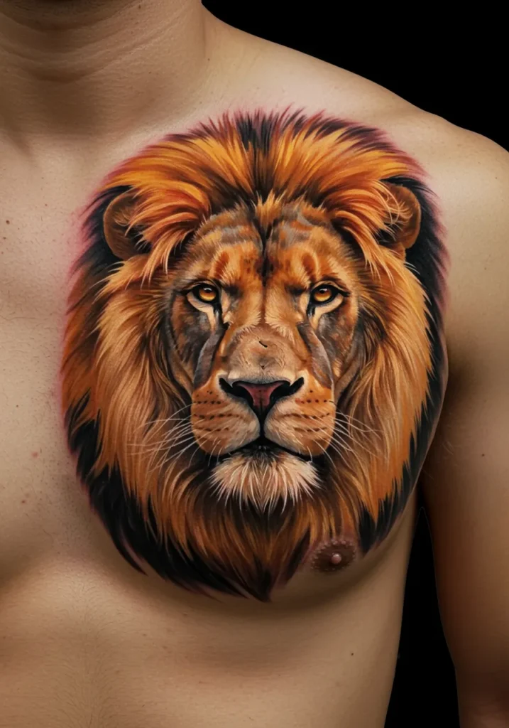 This bold chest tattoo shows a lifelike lion staring straight ahead with deep, wise eyes and a powerful presence. Every strand of the mane is so carefully detailed, blending fiery shades of gold, amber, and brown that make it almost glow against the skin. The lion s face feels strong but calm, like a quiet guardian full of courage and loyalty. The fur looks so soft you can almost feel it, while the intense gaze pulls you in and holds you there.
