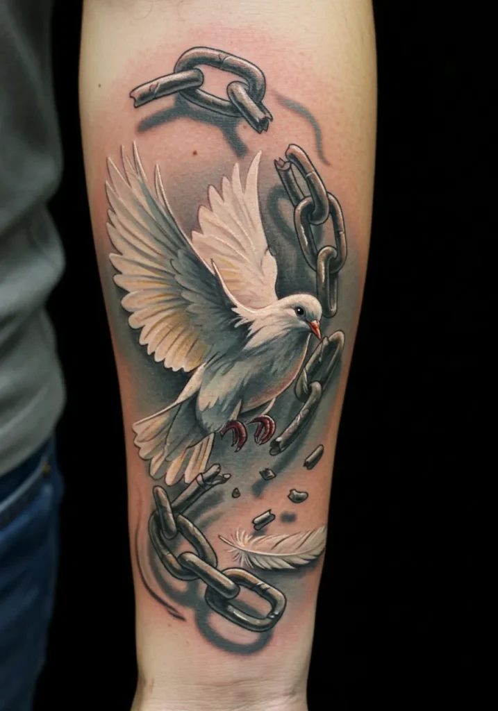 This beautiful forearm tattoo shows a graceful white dove soaring upward, wings wide open, with broken chains falling away beneath it. Every feather is so delicately shaded, giving the bird a soft and almost glowing look against the skin. Pieces of shattered metal scatter around the dove, with a lone feather floating gently nearby, adding even more emotion to the scene. The chains look heavy and real, but the bird rising free from them says everything without needing a single word.