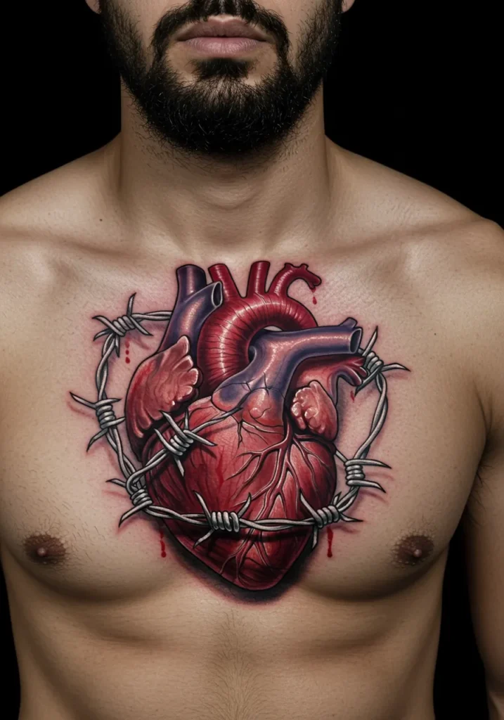 This intense chest tattoo shows a vividly detailed anatomical heart wrapped tightly in barbed wire. The heart looks so real, with deep reds and soft purples showing every curve, vein, and pulse. The barbed wire digs in just enough to add raw emotion without feeling over the top. Little drops of blood add even more weight to the design, making the whole piece feel like a living, breathing symbol of love, pain, and memory all tangled together.