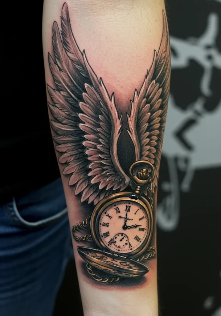This tattoo beautifully captures a vintage pocket watch with its cover swung open, resting against a powerful set of angel wings. The wings stretch tall and full of movement, detailed with deep shading and soft highlights that make each feather pop against the skin. The golden pocket watch shows Roman numerals and fine little details on the chain, giving it an old-world charm that feels timeless. The background shading makes the wings look even more dramatic, almost like they are lifting the watch into the air.