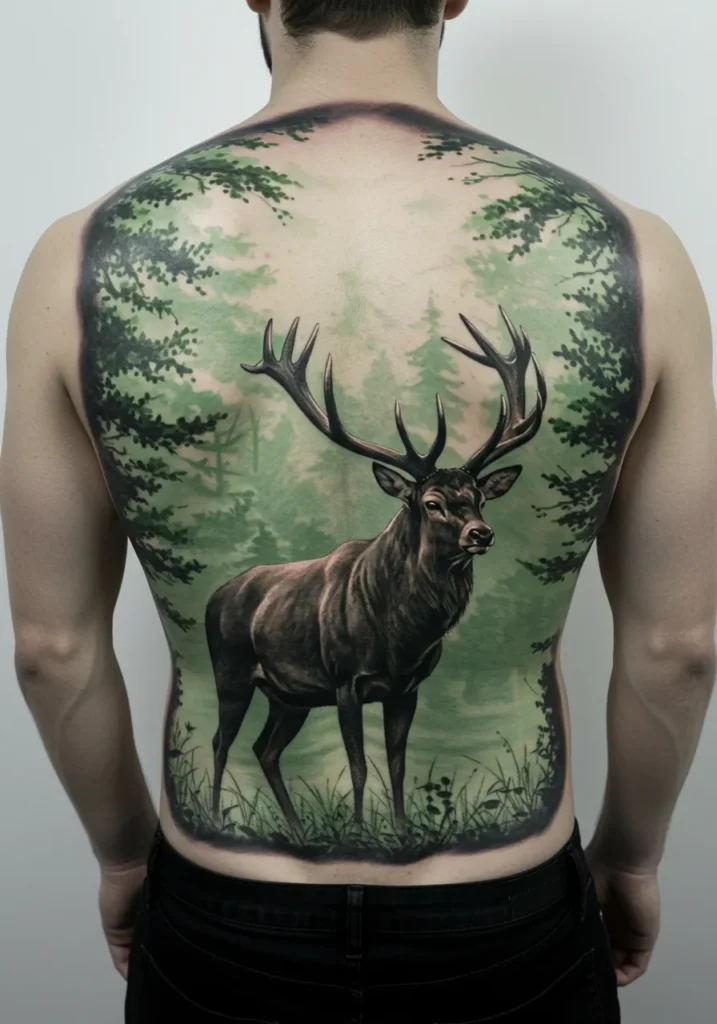 This stunning full-back tattoo captures a proud stag standing tall among soft green forest trees, surrounded by a dreamy mist that makes the whole scene feel almost magical. The shading on the stag is so rich and realistic, with every muscle and antler showing strength and quiet dignity. The blurred trees in the background create such a peaceful, timeless feeling, making the stag feel like a guardian watching over the woods and everything it holds dear.